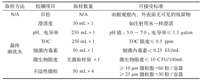 采用澄明度测试仪、多参数仪、总有机碳检测仪、MF 显微细胞圈分析 / 菌落计数 / 筛选 / 抑菌圈测量联用仪、微粒分析仪,分别对最终淋洗水进行澄清度、pH 值、电导率、TOC、微生物限度及不溶性微粒的检测。取样方法、检测项目、取样数量及可接受标准见表 3。