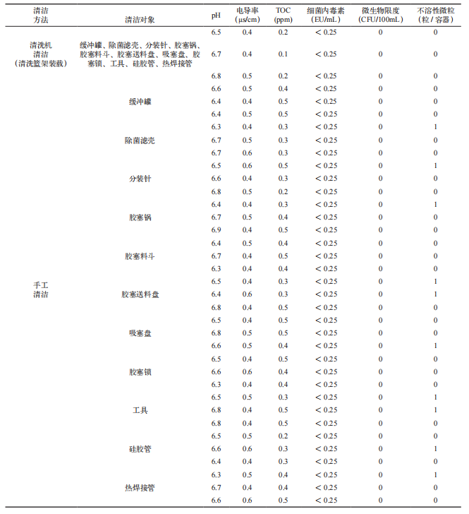 手工清洁和自动清洗机清洁后的分装器具最终淋洗水样经透检后均显示无可见异物,水质如注射用水般澄清,符合生产要求。