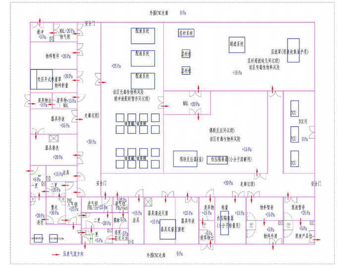 西区配备缓冲液配制系统,储液罐、储液桶、负压称量罩等工艺设备,为了便于操作,考虑到风险可控,将缓冲液配制与缓冲液暂存设计在同一个洁净室,洁净度为 C 级,洁净区压差采用常规的梯度压差等级,配液暂存间考虑投料粉尘异味暴露外溢等,将其压差设置低于 C 级走廊(西区)。东区考虑到小分子毒性物料暴露风险,空调系统需要将暴露风险高的区域排风,或为了节能考虑,采用房间出风口设置空气高效过滤器有效除污染后通过增压风机再回风到空调箱,减少排风能耗浪费。东区分为 2个主要操作功能间,面积较小的为偶联反应间,面积较大的为层析超滤纯化最终收液间,通过 C 级走廊(东区)可以分别进入,两大功能间不采用套间设计,尽量避免相互不利干扰。东区缓冲液储液桶通过设置物料气锁间 MAL,可以分别进入偶联反应间和层析超滤纯化间,满足某些非管道输送缓冲液的生产操作需要。当装有缓冲液的储液桶需要从西区转移到东区使用时,西区人员先将储液桶转移进此 MAL 间,人员原路退回关门后,东区人员再进入气锁间将储液桶转移到东区使用。当东区使用完毕后,储液(空)桶需要从东区返回到西区时,东区人员先将储液桶转移进此气锁间,并用干净抹布将此桶擦拭干净后,东区人员退出关门,该气锁间经过一段自净时间保护后,西区人员再进入此气锁间将桶转移到西区,实现桶使用转移循环;这样既能满足多功能、灵活、高效、经济的操作使用需要,又可以有效避免有毒物料通过缓冲液储液桶携带从东区进入西区,降低有毒区对无毒区的污染风险。考虑到东区操作毒素物料,采用相对负压隔离器、相对负压洁净室两重密闭设计,有效堵漏、防毒性物料随空气扩散外溢。在洁净室压差设定上,有毒的东区洁净室正压值低于相邻西区洁净室正压值,东西区之间的 MAL 间正压值居中,虽低于西侧的缓冲液配制存放间却高于东侧的偶联间、层析纯化间,且东区与外界进出的物料通道均采用风淋传递窗管控,不让东区有毒污染风险的空气因为洁净室正压而外溢流到外围 CNC 走廊区。东区人员更衣考虑到毒性污染风险设置了单独退更通道并设计雾淋后再脱衣,减少脱衣时的有害粉尘等物质外溢污染风险。ADC 偶联车间平面布局示意图设计,既能保证区域的洁净度能够满足C级要求,保证操作需要,保障 ADC 产品质量,又能最大限度地降低有毒物料的外泄降低污染风险。