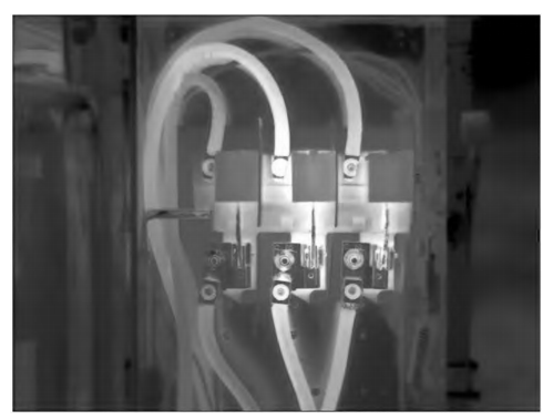 红外热像技术是一种非接触式故障诊断方法,通过探测电气设备表面的红外辐射来分析温度异常分布,从而识别潜在故障。如图 2 所示,热像仪可直观呈现配电设备温度分布情况,使异常热点一目了然。现代工业级热像仪温度分辨率高达 0.05℃,能够精确检测多种电气故障,包括电机绕组过热、电缆连接端子松动和开关柜触点接触不良等问题。电气设备温升与故障发展遵循阿伦尼乌斯方程关系,公式为