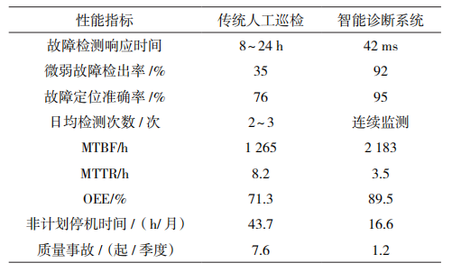 制药压片机故障诊断实验证实了诊断技术的实用价值。ZP-35 压片机主轴轴承故障采用包络分析法,通过 2.1kHz 特征频率识别早期点蚀;混合机电机故障通过电流波形畸变率和定子温度异常诊断绕组短路;灌装机控制系统则采用多源信息融合算法。如表 1 所示,诊断系统响应时间为 42ms,远低于传统人工巡检,显著提高了检测效率。技术实施后,设备可靠性指标明显提升:平均故障间隔时间(Mean Time Between Failures,MTBF)从1265h 增至 2183h,平均修复时间(Mean Time to Repair,MTTR)从 8.2h降至 3.5h,设备综合效率从 71.3% 提升至 89.5%,质量事故大幅减少,实现了设备可靠性和产品质量的协同提升。