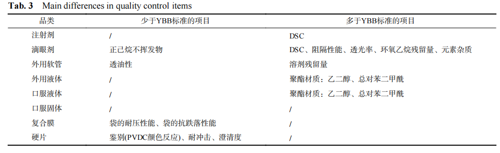 与国家药包材标准 (简称 YBB 标准) 中相关塑料类药包材相比,指导原则质控项目的主要差异见表 3。