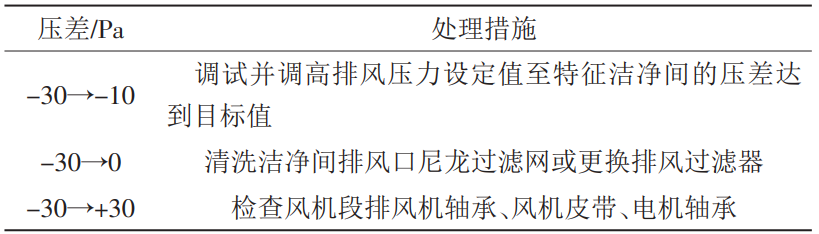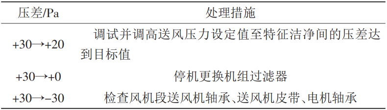 负压洁净间压差明显升高的原因是由于排风过滤器堵塞造成排风量降低,导致负压洁净间的送风量与排风量比例失衡,可以通过调高并调试排风压力设定值至特征洁净间的压差达到目标值。如果负压洁净间压差呈现近 0 压,则需要查看排风机频率。一般来说,此时排风机接近全频率(50 Hz)运行,空调机组的最大排风量难以补偿排风过滤器堵塞减少的风量值,需要停机清洗洁净间内排风口尼龙过滤网或更换排风过滤器。如果发现负压洁净间的压差近正量程(洁净间用压差表的量程一般为+60~-60 Pa),则需要维护人员及时检查排风机段的风机轴承、风机皮带以及电机轴承等部件,发现问题及时维修处理。负压洁净间的压差失灵现象及处理措施见表 2。