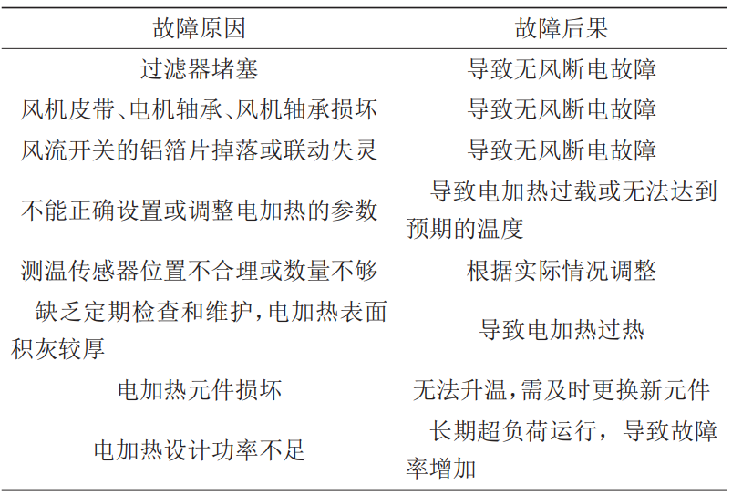 北方地区气候有冬季寒冷、昼夜温差大的特点,使得空调机组的电加热元件启停频繁,故障率较高,尤其在依赖精确温控的温室环节尤为显著。电加热故障不仅威胁到温室调控的精准度和细胞繁殖的质量,还可能造成失火等安全风险。电加热故障的常见原因及后果见表 3。
