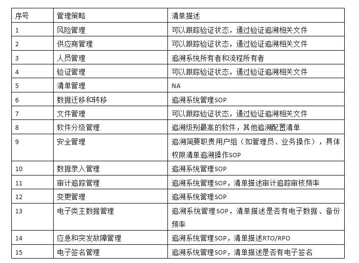 GMP对计算机化系统有很多关键项目,可以通过清单的基础信息简要判断是否存在符合性缺失。如清单登记系统具备电子主记录,而备份章节描述无备份,这通过清单就可以很快的发现,而不用繁琐的去查找验证时是否有电子记录、是否声明电子记录主数据声明、是否有备份规定等等。