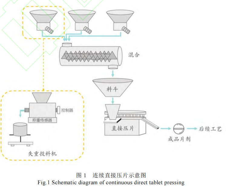 虽然用于制药片剂生产的几个单元操作本质上是连续的,但集成的从粉末到片剂连续生产线相对较新。GEA Pharma systems 首次引入了连续压片多功能平台(ConsiGma™),ConsiGma™系统专为插入式流程,先进先出生产(避免回混)而设计,提供一致的质量并允许对关键质量属性进行在线控制[92]。同时市场上有几种集成的连续压片生产线(例如 Glatt,Lödige,L.B.Bohle)。辉瑞公司和 GEA集团合作开发设计出了一种便携化、连续化、微型、模块化的连续制造平台,该平台集成了 6 种失重式进料器、一台立式混合器与一种旋转压片机,并在压片机饲粉器内配备了近红外系统,压片前可以实时监控含量均匀度并对片剂分流转移不合格的片剂,压片后,对片剂进行除尘,以批生产的方式包衣,离线检测终产品的溶出度、硬度、片重等性质,按需生产药物,Daurismo®和 Cibinqo®均采用这种平台进行制备[93-95]。