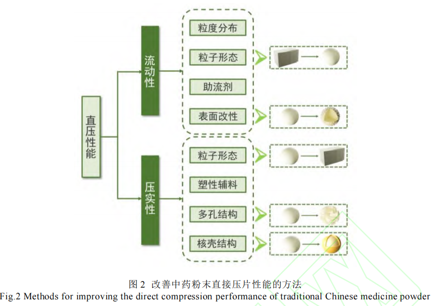 当前,DC-TCMP 存在以下难点:①对物料粉体性质要求高:因未经历制粒过程,需物料具有良好的流动性、填充性和压缩成型性,否则在直压过程中可能会出现可压性差、硬度低、崩解不合格等现象[2];②中药复方粉末自身易分层:因其相容性问题易发生迁移分层,同时其强吸湿性导致粉末流动性急剧下降;③中药粉末与辅料易分层:二者的粒子大小及密度差异会在干混时产生静电,导致物料分层,出现质量差异和成分分布不均的情况[3]。此外,DC-TCMP 依赖高性能辅料,要求辅料除有良好的可压性和流动性外,还需有适宜的松密度和较大的药物容纳量[4]。因此,开发高性能辅料与寻找新技术以改善中药粉末直压特性已成为推进 DC-TCMP 产业化应用的关键突破口[5]。