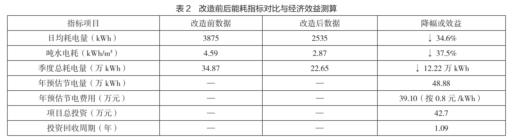 改造后,系统平均每日用电量减少约 1340 千瓦时,总体降幅达到 34.6%,吨水单位能耗下降超过 37%,节能效果显著且稳定。季度节电量超过 12 万千瓦时,按照年均运行周期估算,年节电能力近 50 万千瓦时,折算年节电收益近40 万元。项目总投资控制在 43 万元以内,包括设备采购、系统改造与控制软件配置等各项支出。依据实际运行收益估算,项目投资回收周期约为 1.09 年,体现出良好的经济合理性与实施价值。