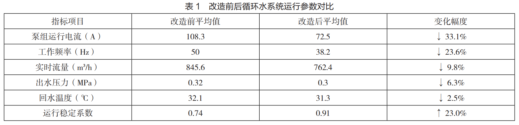 循环水系统在完成变频改造与智能控制系统集成后,进入连续稳定运行阶段。为全面评估改造效果,对泵组运行状态、系统输出参数和关键能效指标开展了为期 90 天的数据采集与分析。所采集数据来自 SCADA 系统中的实时监测记录,具有代表性与可追溯性。比对对象为改造前同期的运行数据,以剔除季节因素干扰。监测内容涵盖水泵运行电流、实际工作频率、供水总流量、出水压力、回水温度以及系统整体运行稳定性等多个维度,能反映变频控制对系统负荷自适应能力的影响。研究选取每日典型工况中多个时段进行统计平均,确保数据样本覆盖不同负荷区间和工艺状态,增强分析结果的广泛性和适用性。结果显示,新系统在维持工艺冷却需求的同时显著降低电机负载,运行状态从固定满载模式转向动态调节模式,呈现出明显的能效优化趋势 [5]。数据对比如表 1 所示: