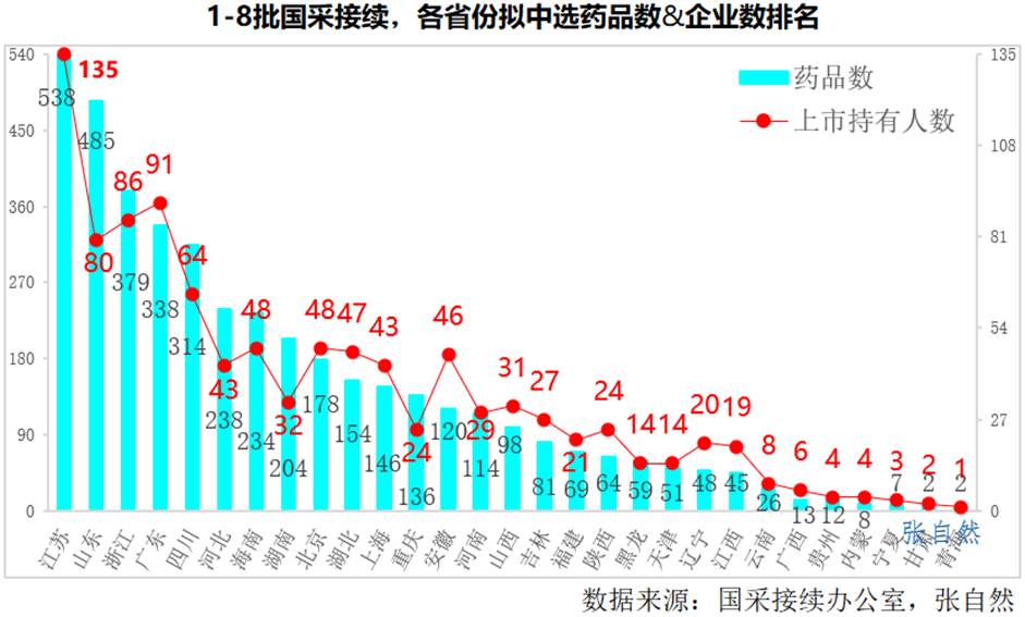 如上图所示,各省份中选企业数量差异也很大(按上市许可持有人注册所在省份计),多则过百家、少则仅1家,前者是后者的135倍。