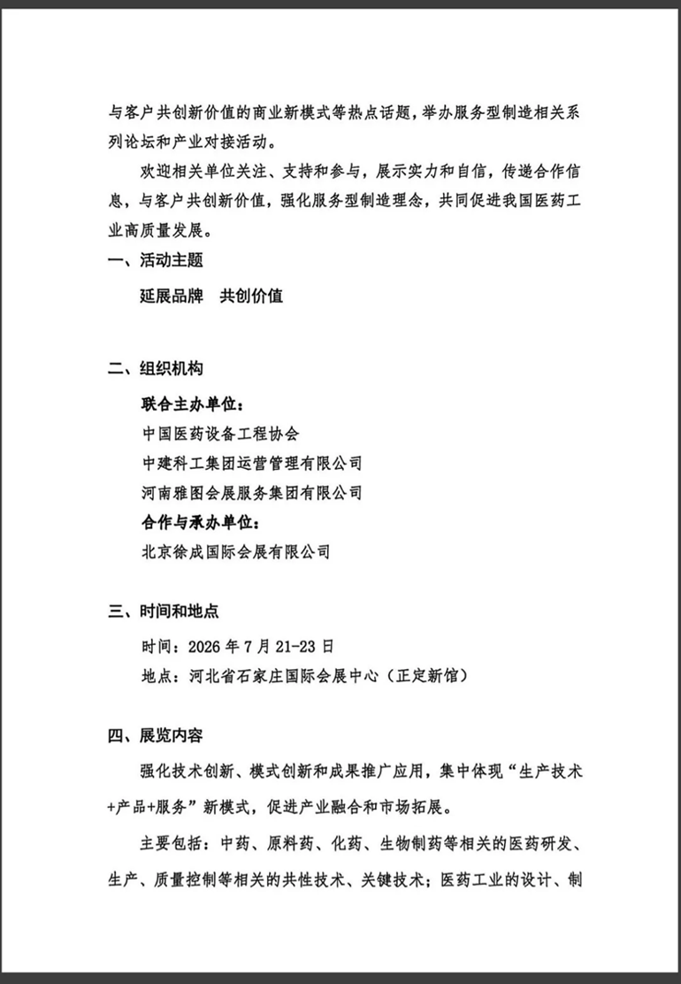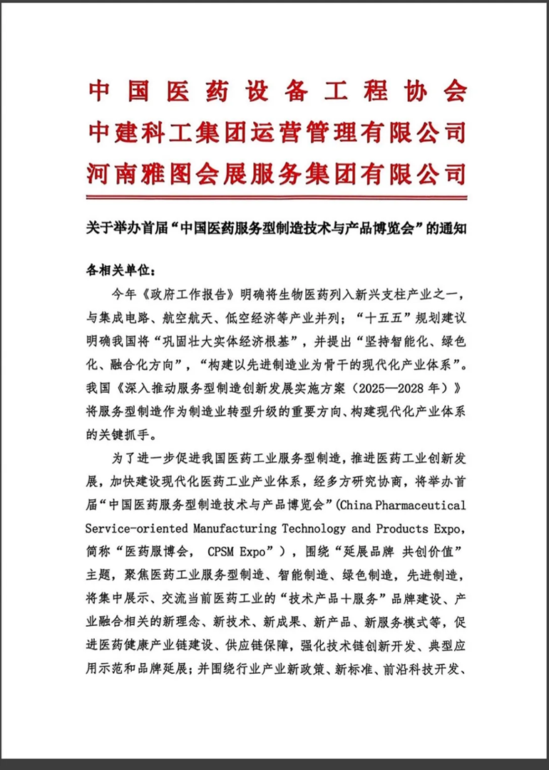 为了进一步促进我国医药服务型制造,推进医药工业先进制造创新发展,加快建设现代化医药工业产业体系,经协商,中国医药设备工程协会、中建科工集团运营管理有限公司与河南雅图会展服务集团有限公司将联合主办首届“中国医药服务型制造技术与产品博览会”(China Pharmaceutical Service-oriented Manufacturing Technology and Products Expo,简称“医药服博会,CPSM Expo”)。