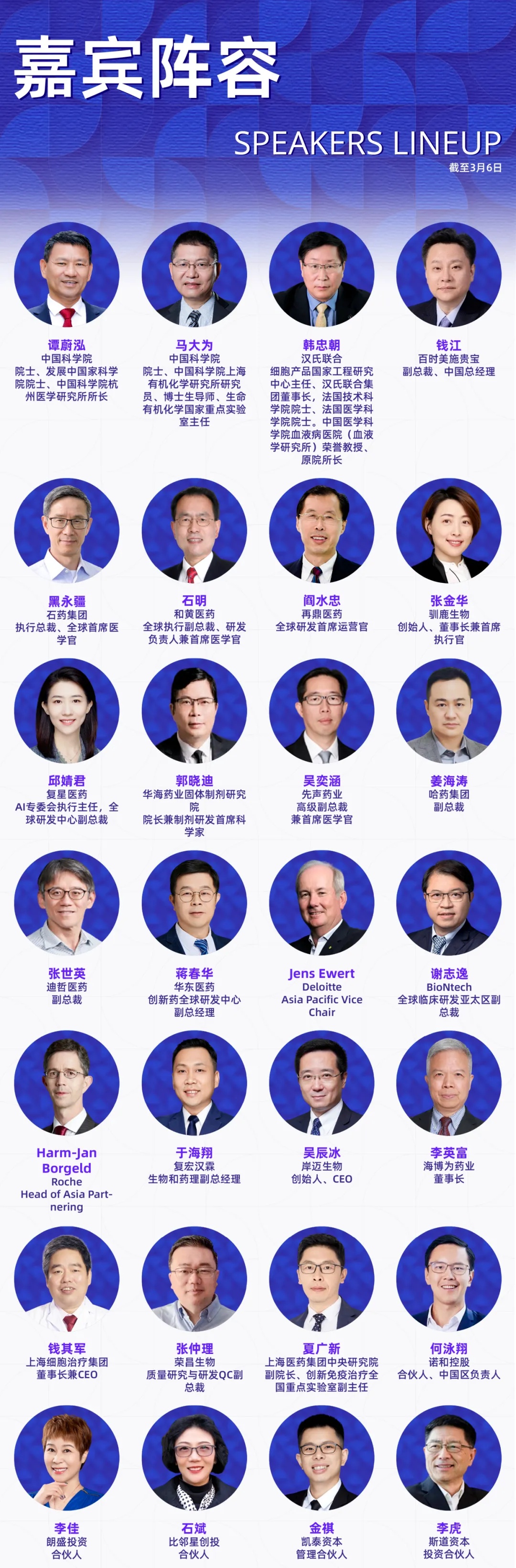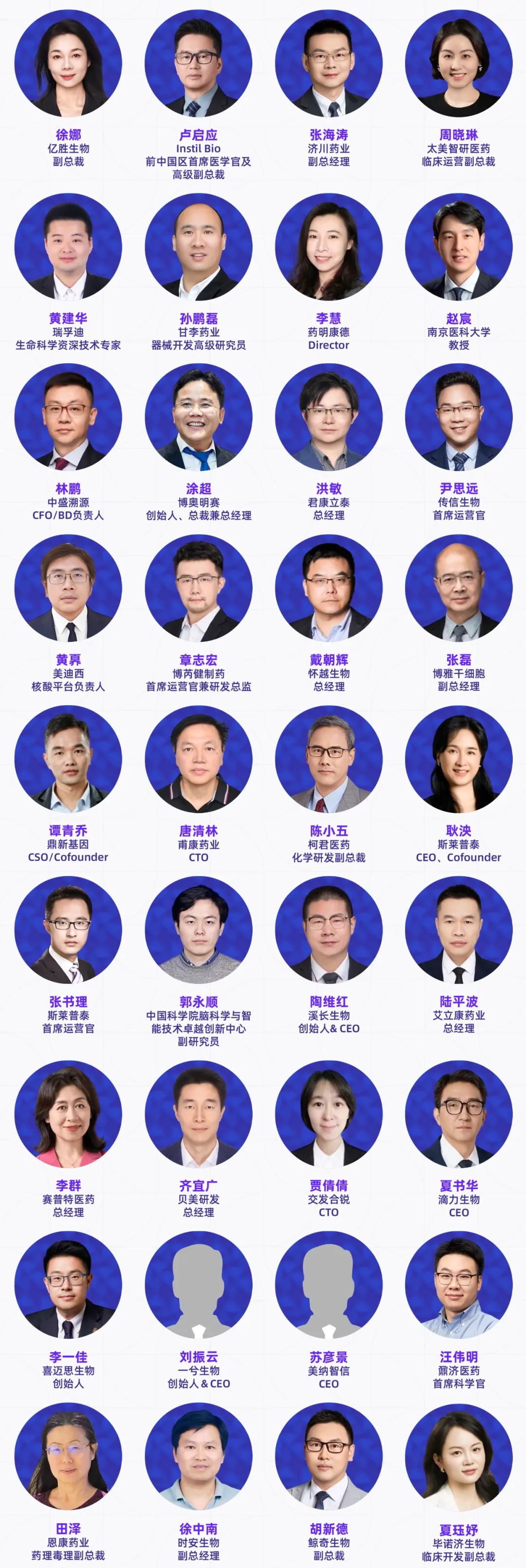 本届大会已确认230+讲者加入,覆盖跨国药企、国内外药企、Biotech高管、创始人、全球开发负责人及核心技术负责人、头部CRO/CDMO管理层及技术专家、科研院所研究学者、临床研究负责人以及投资决策人等产业实践者。他们代表行业领先水平,直接参与真实项目的立项评估、早期发现、临床前研究、临床推进、工艺放大与全球注册路径设计等环节。
